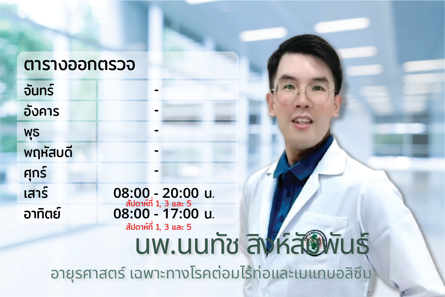 นัดพบแพทย์ ติดต่อ 036 218 9000 ถึง 11 ต่อ 1110