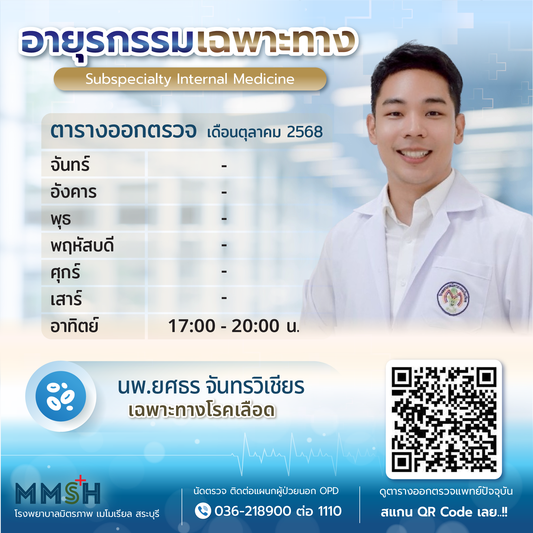 บริการให้คำปรึกษา ตรวจวินิจฉัย และรักษาโรคที่เกี่ยวข้องกับความผิดปกติขององค์ประกอบเลือด เช่น เม็ดเลือดแดง เม็ดเลือดขาว เกล็ดเลือด ด้วยการตรวจเลือดทั่วไป (CBC) และการตรวจเจาะลึกกว่านั้น พร้อมการรักษาโดยแพทย์ผู้เชี่ยวชาญ ครอบคลุมโรคตั้งแต่โลหิตจาง มะเร็งเม็ดเลือด ไปจนถึงการให้เลือด