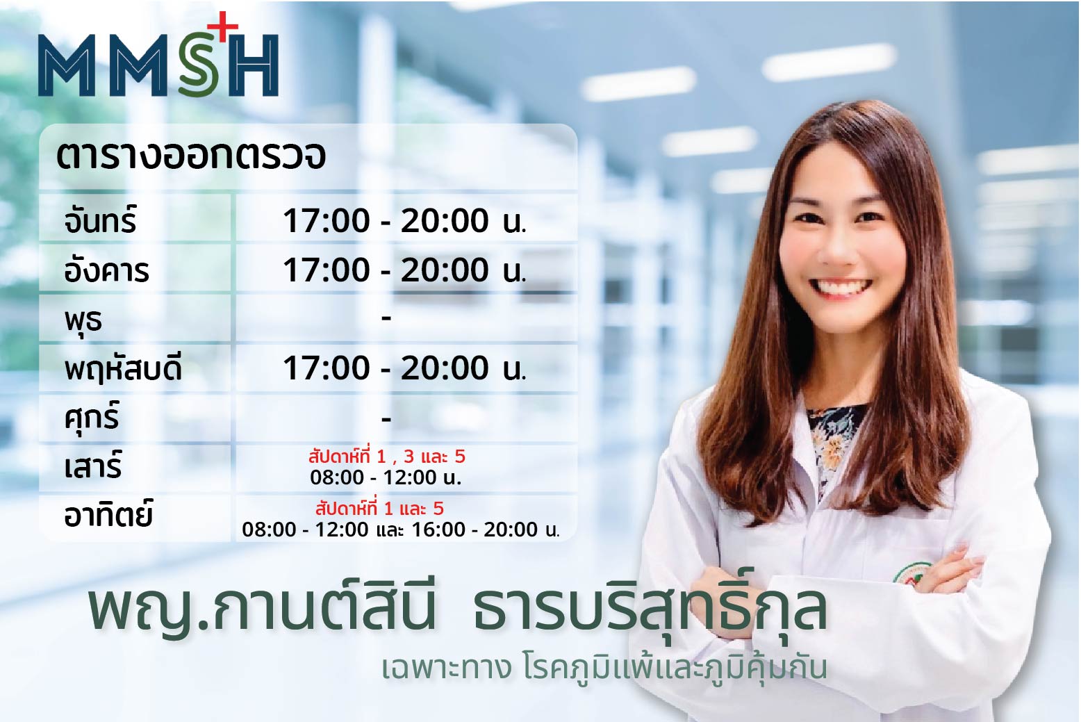 บริการให้คำปรึกษา ตรวจวินิจฉัยและรักษาโรคภูมิแพ้ต่างๆ เช่น โรคหอบหืด โรคแพ้อากาศหรือเยื่อบุจมูกอักเสบจากภูมิแพ้ โรคแพ้อาหารแพ้ยา ผื่นลมพิษ โรคไซนัสอักเสบเรื้อรังที่เกิดจากภูมิแพ้ โรคผื่นผิวหนังอักเสบจากภูมิแพ้ โรคแพ้ภูมิตนเอง ทำการทดสอบภูมิแพ้โดยผ่านทางผิวหนังและผ่านการเจาะเลือดตรวจ พร้อมให้การดูแลรักษาด้วยยาและกระตุ้นภูมิคุ้มกันอย่างใกล้ชิด